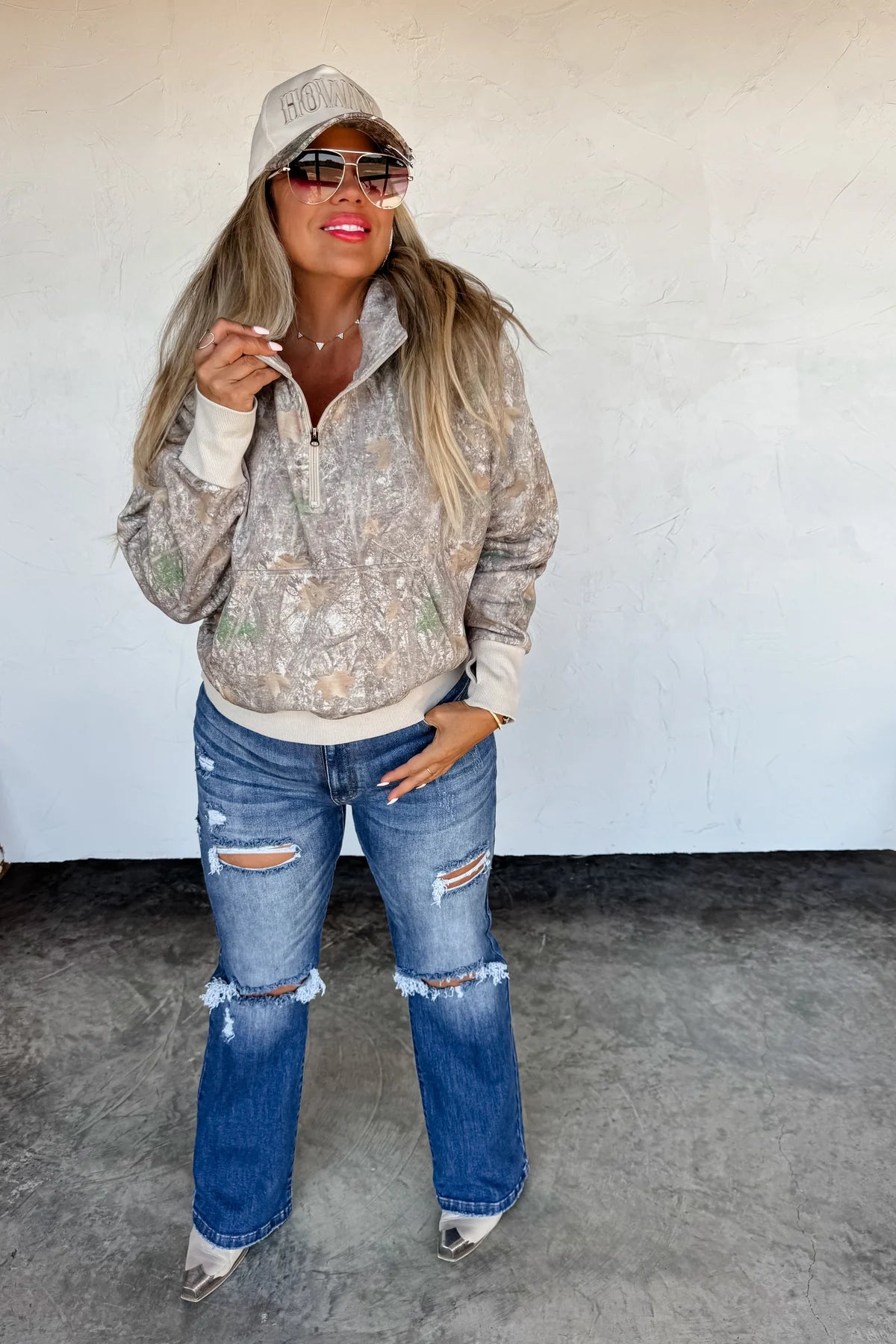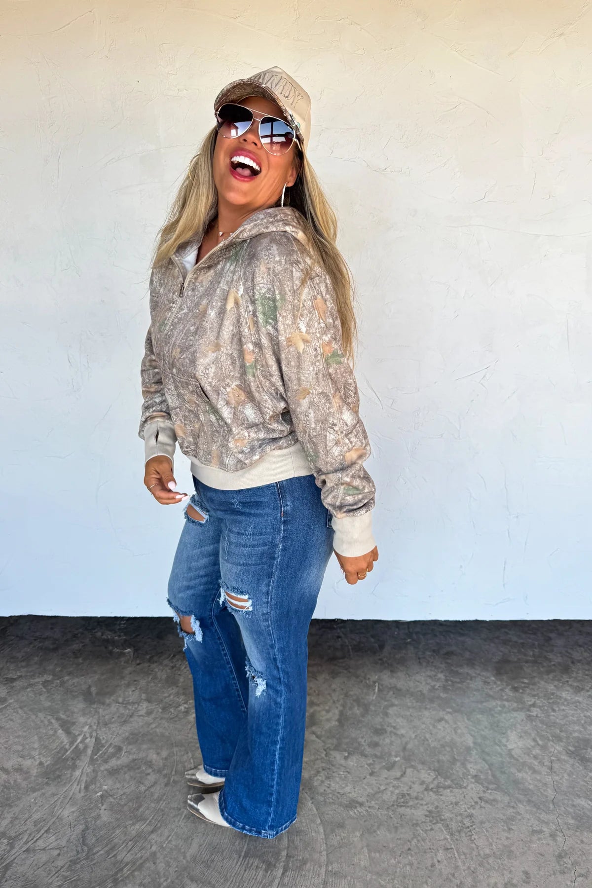Our cute new camo washed hoodie offers a perfect blend of comfort and practicality. Crafted from high-quality fabric, this pullover has a relaxed fit and comes with a front pocket, zip up neckline and hoodie. Semi crop length (covers belly and past top of waist!) Not too short or too long! Perfect! Of course!!! - thumbholes are present!