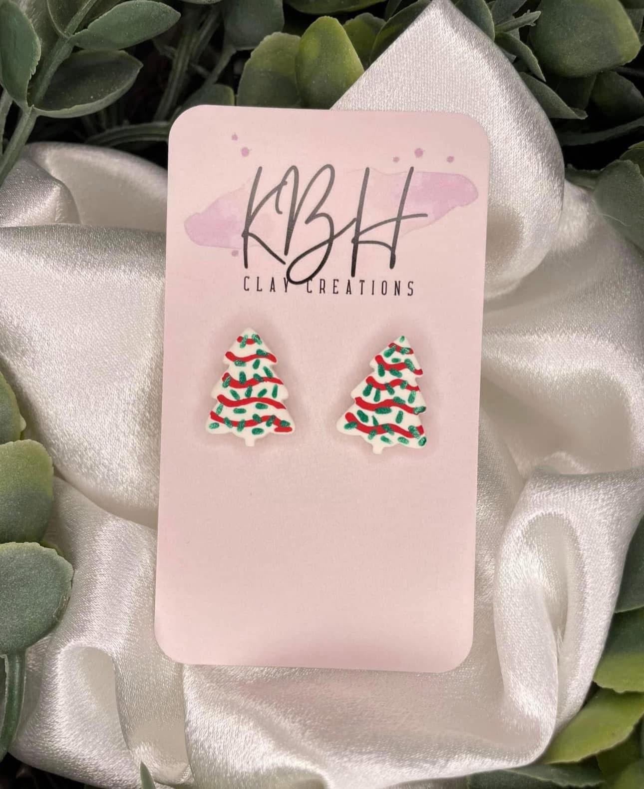 Unique one of a kind handmade clay earrings inspired by your favorite Christmas tree cake snack. Each pair is made in small batches to ensure you get the best quality! Please keep in mind with them being handmade each pair will not be exactly the same as pictured. Handmade clay earrings are super light weight. All backs are hypothetic and to ensure earring post do not fall off all backs are secured with resin.