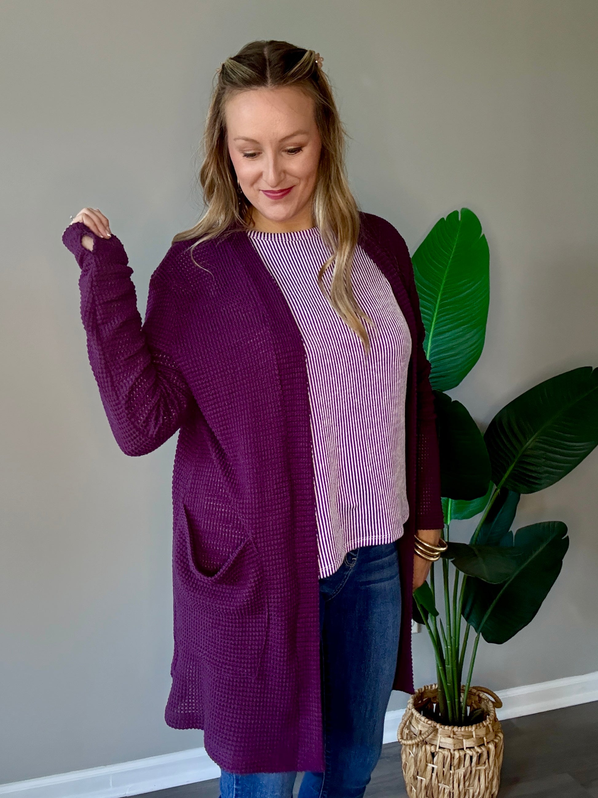 Our popular thumbhole popcorn cardigan you guys have grown to love is now here in Purple!